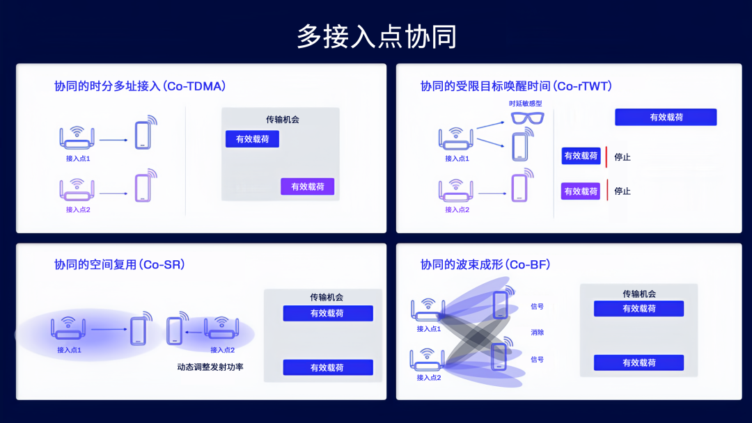 在高密度、网络重叠的环境中,未受管控的干扰和竞争会严重影响性能。Wi-Fi 8通过引入一系列协同机制,使各接入点能够作为一个统一系统运行,从而降低冲突并提升频谱效率。