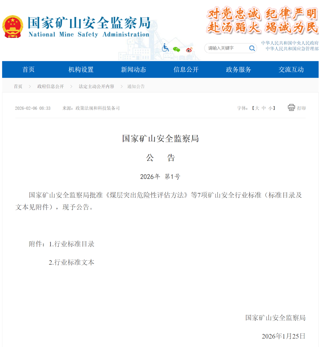 2026年1月25日,国家矿山安全监察局发布2026年第1号公告,正式批准《煤矿井下5G通信系统技术规范》、《金属非金属地下矿山5G通信系统技术规范》等7项矿山安全行业标准,并将于2026年分阶段实施。这批标准的出台,是推动矿山安全治理模式向事前预防转型的关键举措,为煤矿与非煤矿山的瓦斯防治、智能通信、通风管理及个体防护等领域提供了统一、科学、可操作的技术规范,标志着我国矿山安全标准化建设迈上新台阶。